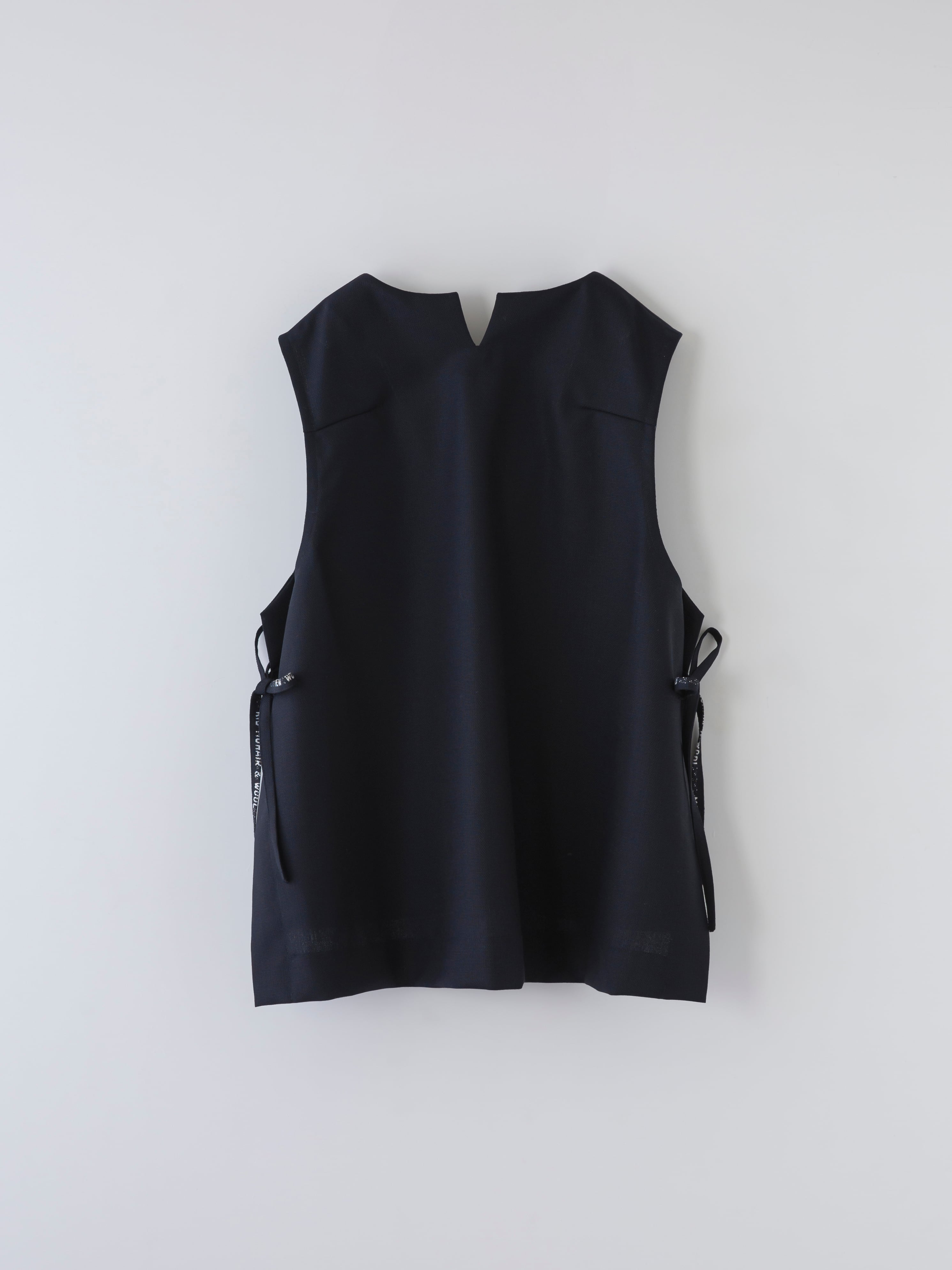 前後の身頃それぞれに脇紐が付いており、結び方を変えることでシルエットのアレンジが楽しめるデザイン。