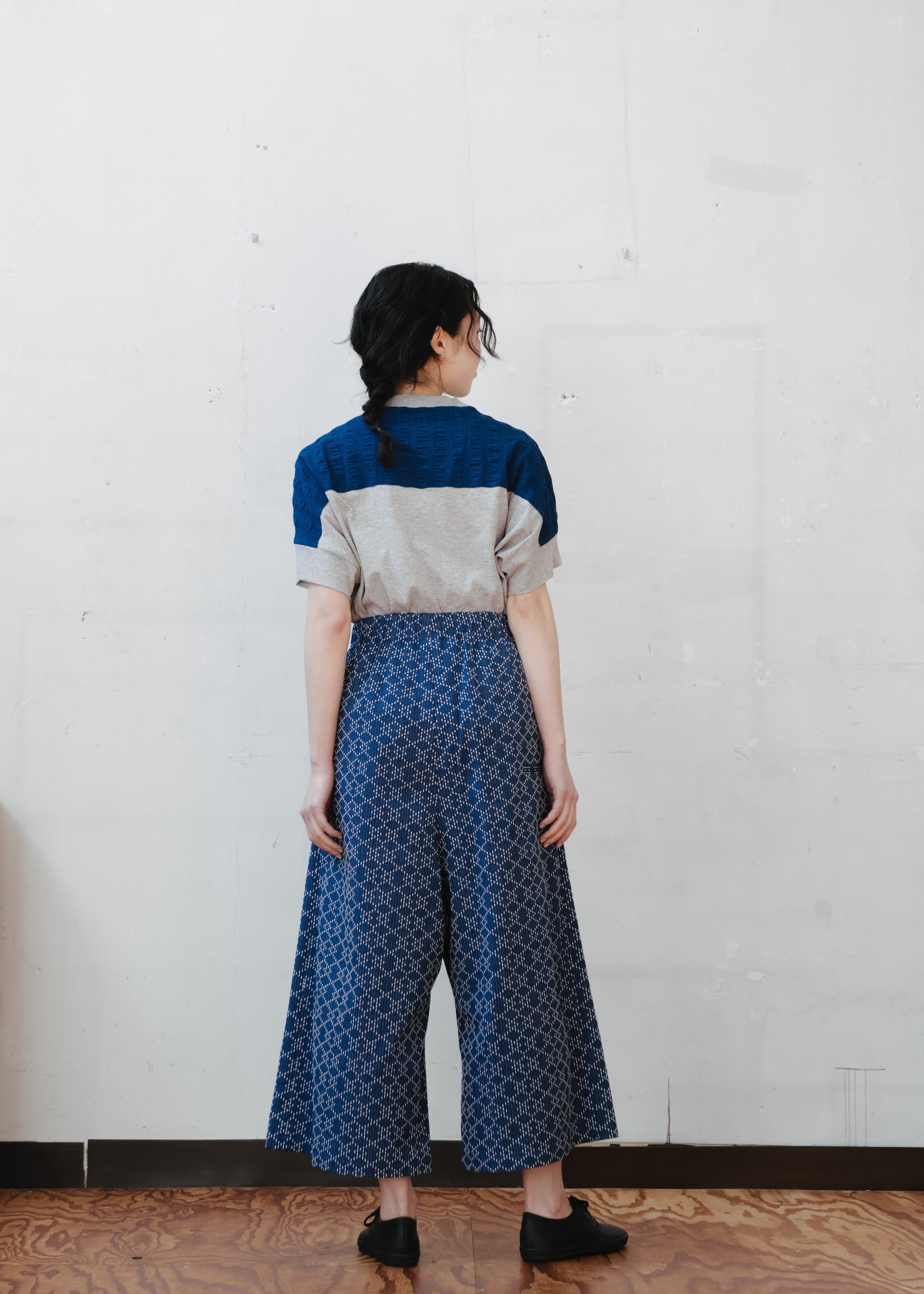 前から見るとAライン、後ろから見るとタッポリとしたサルエルパンツのように見え、